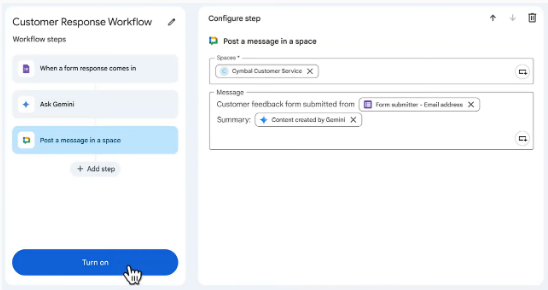 고객 지원 프로세스 자동화: 고객이 구글 폼을 통해 문의를 접수하면, Gemini가 응답을 요약하고 우선순위를 지정합니다. 동시에 고객 서비스 챗 스페이스에 알림을 보내고, Gems를 활용한 AI 에이전트가 답변 초안을 작성하여 이메일을 자동 발송하는 일련의 과정을 연동할 수 있습니다.